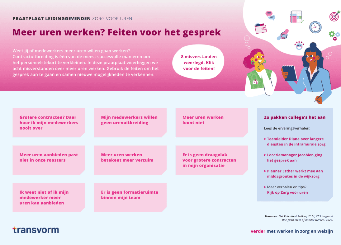 Binnen het programma ‘Zorg voor uren’ zijn daarom praktische praatkaarten ontwikkeld met acht veelvoorkomende misverstanden over meer uren werken. Helder uitgelegd en onderbouwd. Er is een versie voor leidinggevenden en een voor medewerkers.
